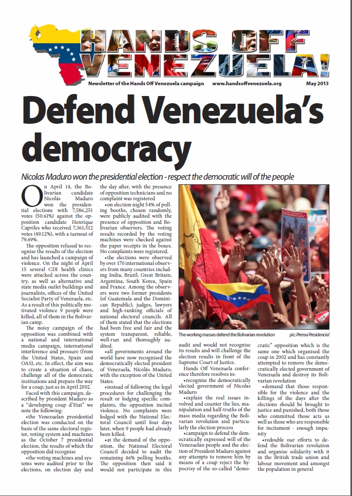 The May 2013 edition of the Hands Off Venezuela Newsletter is out, with articles on the legacy of Hugo Chávez, the presidential elections and the struggle against the opposition's attempted coup, workers control at GOTCHA and a report of the HOV Conference 2013. You can download the PDF file here (1.5MB file)