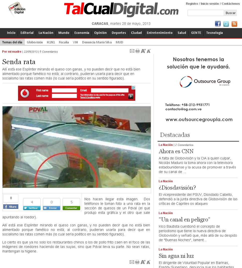 On its May 22 edition, the “newspaper” published a column with the headline “Senda rata” (which can be loosely translated as “What a rat”). It showed a picture of fairly sized rat looking at a piece of cheese in the food counter of a PDVAL shop (identified by the logo in the work uniform of the person working behind the counter). PDVAL is a state-run chain of subsidised price supermarkets which was created in an attempt to deal with the problems of inflation and scarcity. The article, which pretends to be ironic, says that this is proof that “under socialism, rats eat better” (see the article on its website)